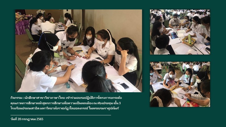 นักศึกษาสาขาวิชาภาษาไทย เข้าร่วมอบรมปฏิบัติการโครงการยกระดับคุณภาพการศึกษาหลักสูตรการศึกษาเพื่อความเป็นพลเมือง 20 ก.ค. 256326 มิ.ย. 2023Dr.Suwitกิจกรรมภายใน